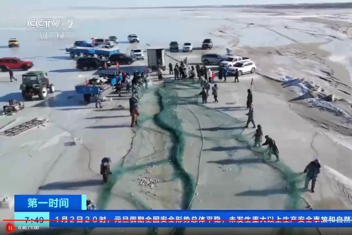 吉林松原:千米大網(wǎng)合圍魚群 冬捕隊拉網(wǎng)出水