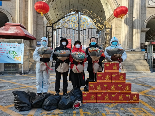 黑龍江經(jīng)濟(jì)網(wǎng)訊(靳超 記者崔冰)慰問(wèn)暖人心,關(guān)懷顯真情。2月3日,黑龍江省誠(chéng)信建設(shè)促進(jìn)會(huì)會(huì)長(zhǎng)張波、副會(huì)長(zhǎng)于海波帶領(lǐng)秘書(shū)處人員來(lái)到哈市榮耀天地小區(qū)看望慰問(wèn)堅(jiān)守在抗疫一線的寶宇物業(yè)管理有限公司的工作人員,傳遞殷切關(guān)懷。張波會(huì)長(zhǎng)和物業(yè)工作人員們深入交流,詳細(xì)了解了他們近期的工作和生活情況,并為他們送來(lái)紅腸及由哈爾濱市萬(wàn)花集鮮花店捐贈(zèng)的鮮花等物資。