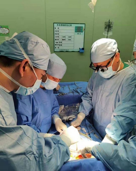 普外科主任崔云甫教授(右)和膽胰外科蘇志雷副教授(左2)應(yīng)用經(jīng)肝臟動(dòng)脈灌注驅(qū)血技術(shù)完成