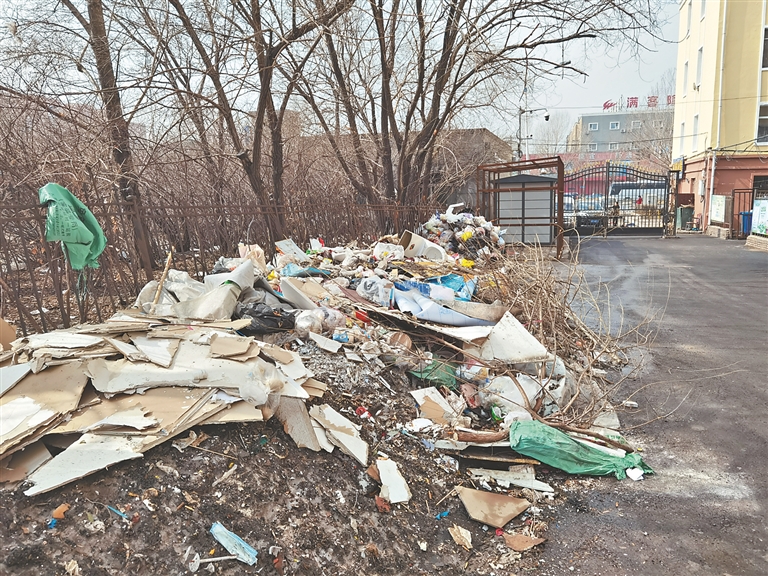 南崗區(qū)學(xué)府路300號至308號之間,是一片改造后的老舊小區(qū),一側(cè)大門還有戴紅袖標(biāo)的人員看守。進(jìn)入后,道路一側(cè)出現(xiàn)了垃圾帶,生活垃圾、裝修垃圾、放棄雜物和殘冰殘雪,堆出了20米的“長龍”。據(jù)這里的居民介紹,小區(qū)沒有物業(yè),衛(wèi)生由街道管理?!坝捎陂L期不外運(yùn),天熱的時候,這里的垃圾會很臭。其實(shí)小區(qū)環(huán)境還不錯,就是缺少管理?!?/span>