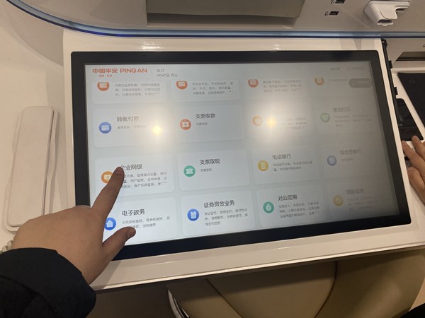 記者看到,智能網(wǎng)點既適老也適小。在互動體驗區(qū),由9塊顯示屏拼接而成的屏幕區(qū)格外引人注意。顯示屏分別顯示著網(wǎng)點的理財產(chǎn)品、營銷數(shù)據(jù)等,每15分鐘就會進行一次更新。不僅如此,客戶還可以在這里玩游戲、拍照片。李權(quán)介紹,很多時候,客戶的焦慮來自等待,一些帶著孩子來辦理業(yè)務(wù)的客戶,最怕小朋友無聊,通過互動體驗區(qū),小朋友可以在屏幕前玩游戲,這樣客戶辦理業(yè)務(wù)時也能更安心?!拔覀兊姆?wù)區(qū)域用來滿足客戶日常業(yè)務(wù)辦理需求,而游戲、特色景點、交通、美食等混業(yè)信息的交互則能消除顧客的等候焦慮?!崩顧?quán)說道。