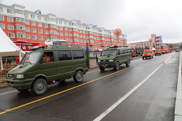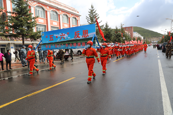 9時(shí),反思活動(dòng)正式開始。林業(yè)局處級領(lǐng)導(dǎo)與職工群眾鄭重地在在“牢記歷史 汲取教訓(xùn) 振奮精神 開拓進(jìn)取 建設(shè)美麗藍(lán)莓小鎮(zhèn)”宣傳條幅上,鄭重地簽上了自己的名字。并舉行了聲勢浩大的人員游行、車輛游行。由運(yùn)兵車、運(yùn)兵車、人工增雨車等26臺(tái)特種車輛,拉響警報(bào),緊跟在由森林消防大隊(duì)組成的100余人步行方陣后,他們身穿防火戰(zhàn)斗服,手舉寫有“‘五?六’反思”巨型防火宣傳牌和防火宣傳彩旗,尤其是手執(zhí)高速渦流噴射滅火機(jī)、脈沖槍、斯蒂爾風(fēng)力滅火機(jī)的隊(duì)員,邁著整齊的步伐,喊著響亮的口號(hào),立即吸引了過往的居民的注意,成為最亮眼的“明星”。
