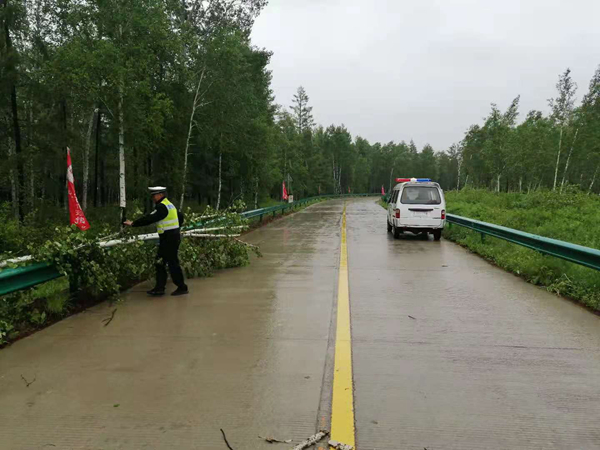 交警大隊(duì)派出警力增援北極中隊(duì),擴(kuò)大巡邏范圍,及時(shí)排查發(fā)現(xiàn)G111、G331國(guó)道、景區(qū)周邊路段交通隱患。在北極村至北紅村路段,發(fā)現(xiàn)由于暴雨沖刷,該路段3處山石、樹枝堆積在路面,2處樹木刮倒,嚴(yán)重影響路面通行安全。巡邏民警立即對(duì)險(xiǎn)情進(jìn)行處置。針對(duì)3處漫水較為嚴(yán)重區(qū)域,設(shè)置警戒線等警示標(biāo)志,告知過往車輛通行路況,提醒車輛減速慢行,同時(shí)通知相關(guān)部門及時(shí)處置。
