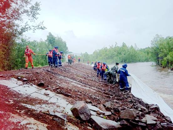 6月18日,呼中鎮(zhèn)景觀大壩部分堤壩出現(xiàn)險(xiǎn)情,護(hù)堤水泥塊被沖塌陷,鎮(zhèn)內(nèi)地勢低洼地帶居民房屋、田地進(jìn)水,呼中鎮(zhèn)聯(lián)合區(qū)公安局、區(qū)應(yīng)急管理局、區(qū)水務(wù)局、呼中林業(yè)局專業(yè)森林消防大隊(duì)等單位,共同搶修堤壩、抗擊洪水,疏通受災(zāi)居民住戶的水道,保護(hù)人民群眾生命財(cái)產(chǎn)安全。