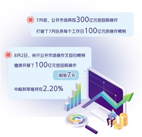 7月底,公開市場(chǎng)再現(xiàn)300億元逆回購(gòu)操作,打破了7月以來每個(gè)工作日100億元的操作慣例。7月29日、30日,中國(guó)人民銀行連續(xù)發(fā)公告稱,為維護(hù)月末流動(dòng)性平穩(wěn),以利率招標(biāo)方式開展了300億元逆回購(gòu)操作,期限7天,中標(biāo)利率維持在2.20%不變。