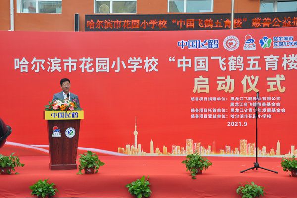 飛鶴乳業(yè)黨委書記、飛鶴慈善基金會(huì)理事長朱天龍在啟動(dòng)儀式上說,在中秋國慶即將到來之際,我們滿懷喜悅的心情,在百年名校哈爾濱市花園小學(xué)校舉行“中國飛鶴五育樓”公益慈善助教項(xiàng)目啟動(dòng)儀式,這是飛鶴乳業(yè)履行社會(huì)責(zé)任、情系教育事業(yè)的又一項(xiàng)助教工程。在黑龍江省貫徹落實(shí)黨中央“雙減”政策,深入推進(jìn)五育并舉,促進(jìn)學(xué)生德智體美勞全面發(fā)展的重要時(shí)期。飛鶴向哈爾濱市花園小學(xué)捐贈(zèng)625萬元,用于花園小學(xué)“五育樓”項(xiàng)目改造,這是一項(xiàng)利在當(dāng)代,功在千秋的公益慈善助教項(xiàng)目,旨在更好地優(yōu)化我省基礎(chǔ)教育教師學(xué)習(xí)培訓(xùn)環(huán)境,為花園小學(xué)教學(xué)提供更好的辦學(xué)條件,也是助力黑龍江省基礎(chǔ)教育的改革。省教育廳副廳長姜同河、團(tuán)省委副書記張濤對飛鶴乳業(yè)的慈善助教善舉給予充分的肯定和贊許?;▓@小學(xué)校長曹永鳴代表學(xué)校的孩子們向飛鶴乳業(yè)的慈善捐助表達(dá)深深的謝意!