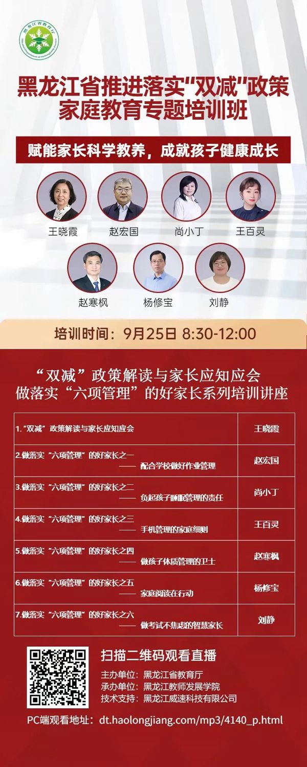 據(jù)了解,此次培訓是《黑龍江省中小學“百萬家庭賦能”工程實施方案》重要組成部分,也是省教育廳踐行黨史學習教育“我為群眾辦實事”,解決群眾急難愁盼問題的具體舉措,由省教育廳主辦、黑龍江教師發(fā)展學院承辦,基礎教育處處長領銜六位家庭教育專家共同開講,時長三個半小時,受到廣大家長的一致好評,取得良好的社會反響,直播時瀏覽峰值達到210.7萬人次。培訓內容緊緊圍繞廣大家長們“雙減”形勢下的困惑,深入宣傳“雙減”政策和年初以來教育部相繼下發(fā)的關于手機、作業(yè)、睡眠、讀物、體質、考試等“六項管理”文件內容,分七個專題進行深入細致的家庭教育指導,有的放矢地解答家長“心中所疑”、化解家長“心中所急”,很多家長通過家庭學校群進行交流,有的家長反饋道:“通過觀看直播我們家長深刻體會到一定要以身作則,在孩子面前少玩手機,多陪孩子閱讀書籍,多讓孩子進行戶外活動?!庇械募议L則表示,聽了講座深刻理解了孩子成長的根基深植于家庭教育的道理,家庭教育才是孩子的起跑線,主動地配合學校落實“雙減”政策,從做好“六項管理”入手科學優(yōu)化家庭教養(yǎng)方式,減少孩子的校外培訓和作業(yè)負擔,還給孩子一個幸福的童年,做一名智慧家長。