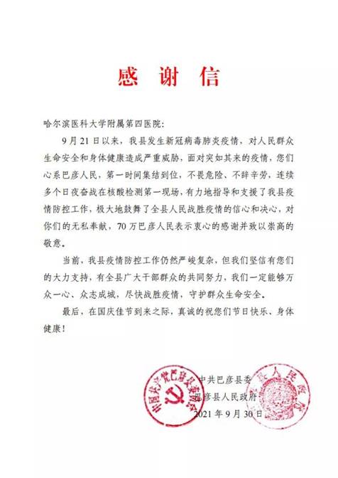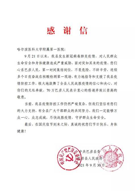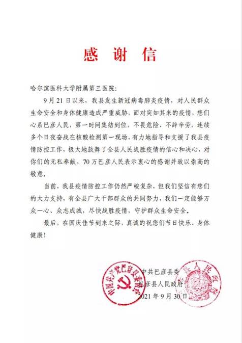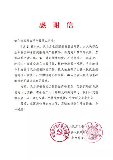黑龍江經(jīng)濟網(wǎng)訊(黑龍江日報全媒體見習(xí)記者董廣碩 商祺)近日,哈爾濱醫(yī)科大學(xué)附屬一院、二院、腫瘤醫(yī)院、四院分別收到巴彥縣委縣政府的感謝信,感謝他們“有力地指導(dǎo)和支援了我縣疫情防控工作,極大地鼓舞了全縣人民戰(zhàn)勝疫情的信心和決心。”