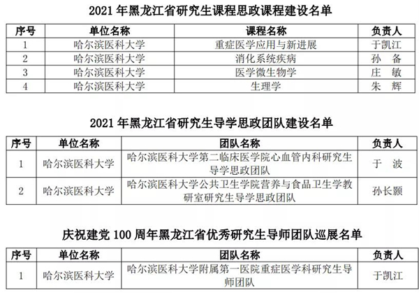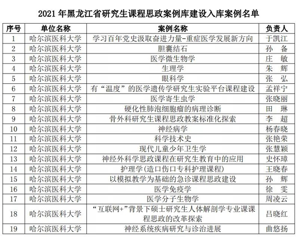 黑龍江經(jīng)濟(jì)網(wǎng)訊(黑龍江日報(bào)全媒體見習(xí)記者董廣碩 商祺)為貫徹落實(shí)國家《關(guān)于全面落實(shí)研究生導(dǎo)師立德樹人職責(zé)的意見》《高等學(xué)校課程思政建設(shè)指導(dǎo)綱要》《關(guān)于加快新時代研究生教育改革發(fā)展的意見》精神,按照《關(guān)于加快新時代黑龍江省研究生教育改革發(fā)展的實(shí)施意見》要求,日前,經(jīng)全省研究生培養(yǎng)單位遴選推薦,黑龍江省研究生課程思政教育聯(lián)盟專家委員會評審,省學(xué)位委員會、省教育廳批準(zhǔn),哈爾濱醫(yī)科大學(xué)共有26個項(xiàng)目獲批省級立項(xiàng),其中研究生課程思政課程建設(shè)項(xiàng)目4個、研究生導(dǎo)學(xué)思政團(tuán)隊(duì)(導(dǎo)師)建設(shè)項(xiàng)目2個、研究生課程思政案例19個,慶祝建黨100周年巡展優(yōu)秀研究生導(dǎo)師團(tuán)隊(duì)1支。