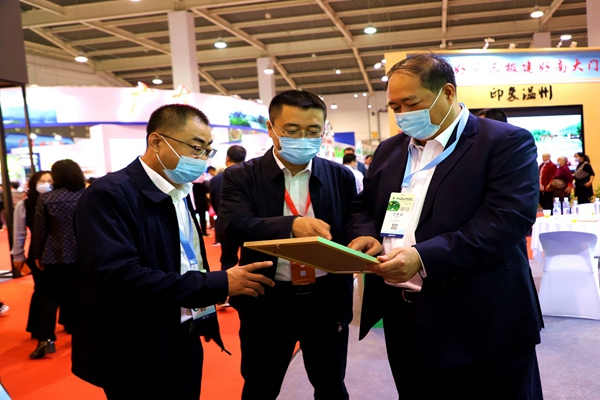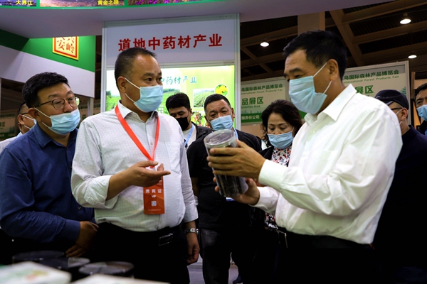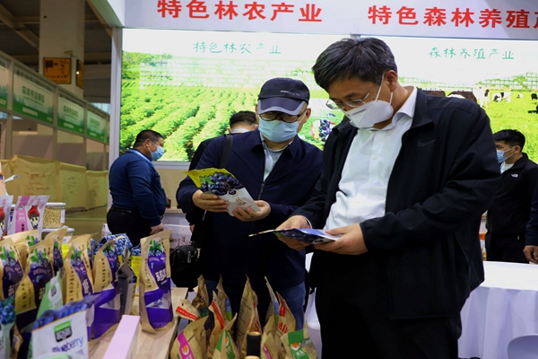 阿木爾林業(yè)局黨委書(shū)記胡守慶(右一)查看參展產(chǎn)品質(zhì)量情況(王力/攝)