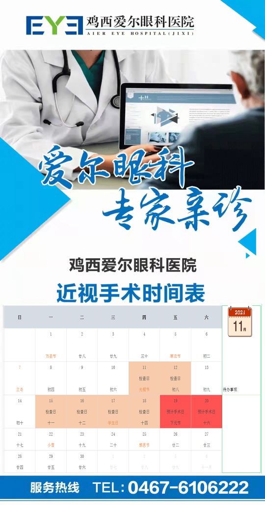 雞西愛爾眼科醫(yī)院近視手術(shù)時間表: