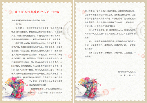 據(jù)介紹,省醫(yī)院支援黑河應(yīng)急醫(yī)療隊(duì)共收治新冠肺炎患者69人,其中重癥1例,最小的患者2歲,最大的患者90歲,在兄弟單位接手前,共治愈出院35人。治療期間,醫(yī)療隊(duì)收到了多封患者表揚(yáng)信,小患者們則用畫筆表達(dá)了對(duì)天使們的感謝與敬仰,有的未出院患者聽說省醫(yī)院醫(yī)療隊(duì)要離開了,都依依不舍,紛紛表達(dá)對(duì)醫(yī)療隊(duì)精湛的醫(yī)技和暖心醫(yī)療的感謝。