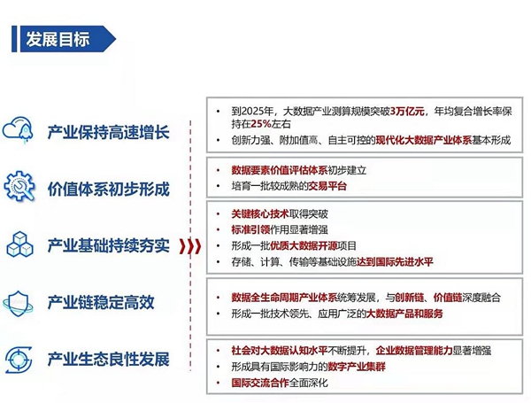 規(guī)劃明確,到2025年,大數(shù)據(jù)產(chǎn)業(yè)測(cè)算規(guī)模突破3萬(wàn)億元。其中特別提出,數(shù)據(jù)要素價(jià)值評(píng)估體系初步建立;產(chǎn)業(yè)基礎(chǔ)持續(xù)夯實(shí),關(guān)鍵核心技術(shù)取得突破;形成一批技術(shù)領(lǐng)先、應(yīng)用廣泛的大數(shù)據(jù)產(chǎn)品和服務(wù)。