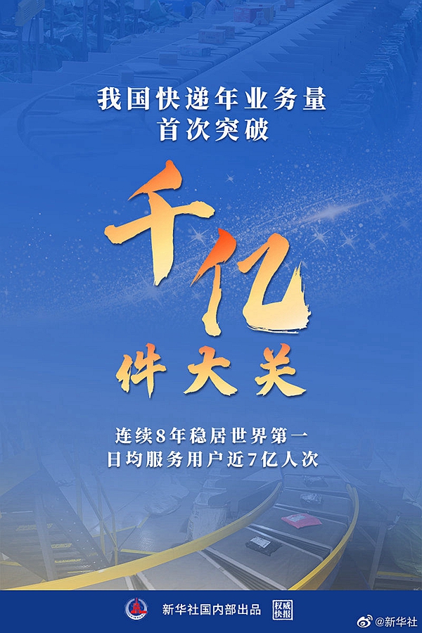 12月8日,國家郵政局快遞大數(shù)據(jù)平臺(tái)實(shí)時(shí)監(jiān)測(cè)數(shù)據(jù)顯示,2021年我國快遞業(yè)務(wù)量已達(dá)1000億件,這是我國快遞年業(yè)務(wù)量首次突破千億級(jí)別,已連續(xù)8年穩(wěn)居世界第一,日均服務(wù)用戶近7億人次。(新華社記者戴小河 海報(bào)設(shè)計(jì)楊軼群)