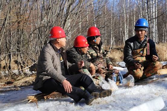 阿木爾林業(yè)局多種經(jīng)營公司干部職工在修復水毀橋時利用歇息時間研究下步工作(王力 攝)