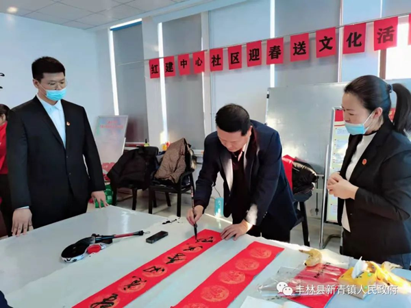 1月18日,豐林縣文聯(lián)邀請(qǐng)了該縣書法家協(xié)會(huì)會(huì)員及書法藝術(shù)愛(ài)好者6人,深入到新青鎮(zhèn)所轄社區(qū)現(xiàn)場(chǎng)為居民書寫并贈(zèng)送春聯(lián)和福字。在新青鎮(zhèn)紅建社區(qū),書法家們揮毫潑墨,奮筆疾書,紅幅鋪展、妙句成雙,滿室濃墨飄香,到處洋溢著春的氣息。