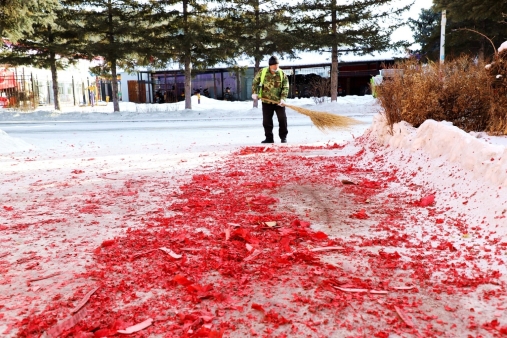 黑龍江經濟網訊(王力 記者馬朝林)天剛蒙蒙亮,呈現眼前的是大年三十夜晚燃放的鞭炮紙屑,遍地開花,仿佛是紅地毯一樣。多名環(huán)衛(wèi)工冒著零下30多度的嚴寒,不顧帽子、眉毛結滿冰霜,有的用掃帚清掃,有的撿拾紙屑煙頭,有的推移垃圾箱……