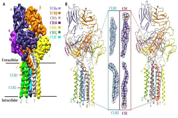 T細(xì)胞是脊椎動物適應(yīng)性免疫的重要細(xì)胞,在病毒感染、癌癥以及自體免疫疾病中起著關(guān)鍵作用。T細(xì)胞通過其TCR-CD3受體復(fù)合物特異性識別抗原,將胞外的抗原識別信號跨膜傳遞到T細(xì)胞內(nèi),激活胞內(nèi)的適應(yīng)性免疫信號通路,啟動免疫反應(yīng)。2019年,該課題組在《自然》(Nature)上發(fā)表了題為“人T細(xì)胞受體-共受體復(fù)合物組裝的結(jié)構(gòu)基礎(chǔ)”(Structural basis of assembly of the human TCR-CD3 complex)的研究文章,首次解析了人T細(xì)胞受體復(fù)合物(包含全部8個亞基)的高分辨率冷凍電鏡結(jié)構(gòu),揭示了TCR-CD3亞基在膜外側(cè)以及膜內(nèi)識別、組裝成功能復(fù)合物的分子機(jī)制。但一直以來,T細(xì)胞受體如何將胞外抗原信號傳遞到胞內(nèi)激活T細(xì)胞的這一關(guān)鍵機(jī)制的結(jié)構(gòu)基礎(chǔ)并不清楚。