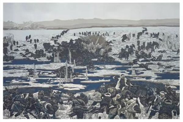 版畫作品《冰趟子戰(zhàn)役中的趙尚志》實(shí)景再現(xiàn)了東北抗日聯(lián)軍殲敵最多的著名戰(zhàn)役一一冰趟子戰(zhàn)役,展現(xiàn)了趙尚志同志指揮若定、英勇殲敵的英雄形象??孤?lián)戰(zhàn)士借助冰趟子封凍這一東北地區(qū)特有的有利地形,化被動(dòng)為主動(dòng),對(duì)尾追日軍進(jìn)行伏擊,殲滅大量日軍。體現(xiàn)了東北抗聯(lián)在極其惡劣的條件下,捍衛(wèi)中華民族的無畏斗爭精神。