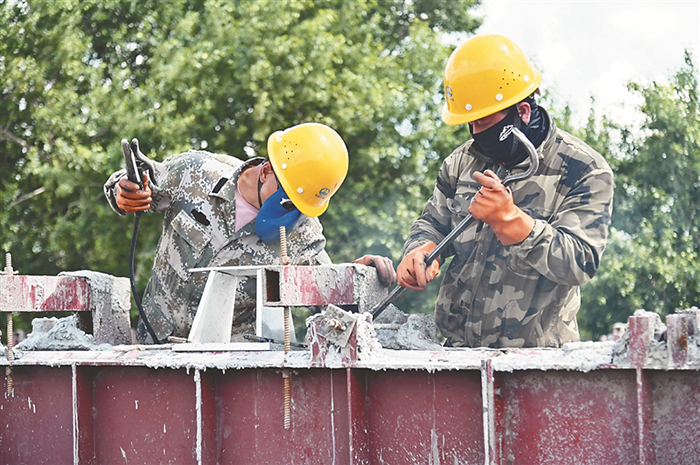 身處建設現(xiàn)場,記者聽到最美的聲音就是各種機器的嗡鳴。順著電鉆的嗡嗡聲,記者看向一棟3層建筑。劉明軍介紹,這棟建筑是身兼展示功能的辦公樓,正在進行外幕墻裝飾。與之相鄰的二層建筑上,工人們正忙著進行二次結(jié)構(gòu)砌筑。