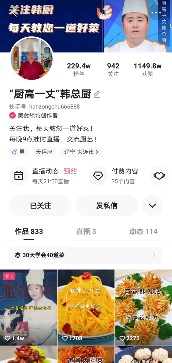 “我只想踏踏實實地教大家做菜,粉絲們只要跟著我的課程一步步做,做出的菜品味道絕不會差?!睆臐M足粉絲的需求出發(fā),韓總廚憑借一條條制作精良、干貨滿滿的視頻課程,積累了229.4萬粉絲,榮升成粉絲心目中的“老大”。