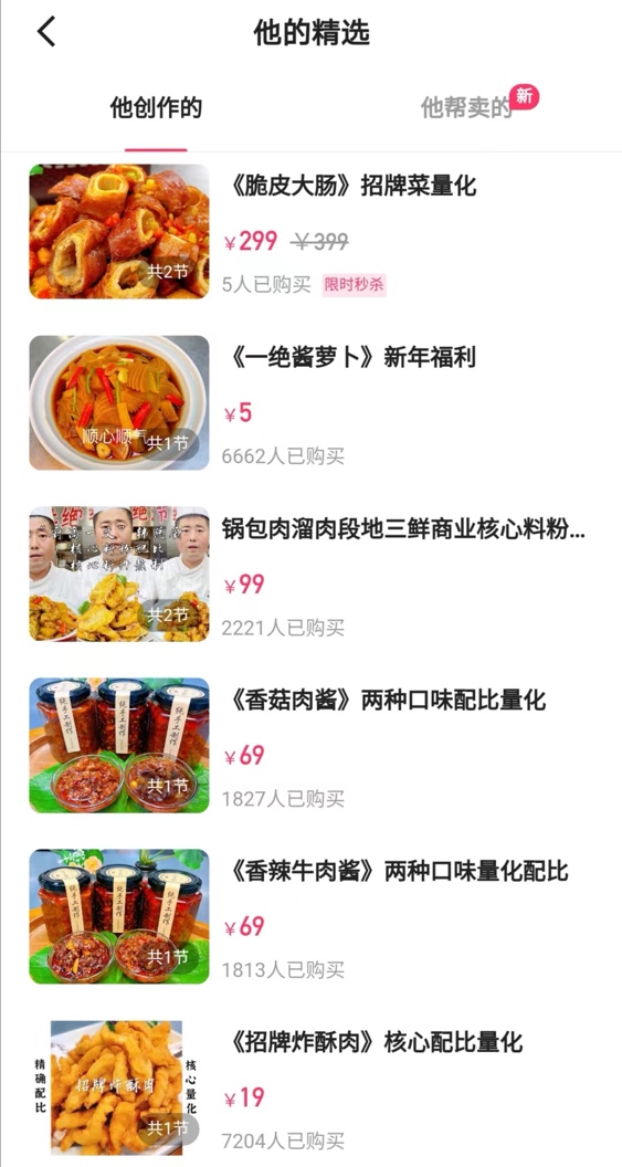 作為一位有著25年美食領域從業(yè)經驗的老廚師,韓總廚憑借一手精湛的廚藝,來到快手后很快就積累了上萬粉絲,為他打造付費課程奠定了基礎?!皩Ρ攘似渌_人的內容,我覺得自己還是有一定的內容優(yōu)勢的,所以也試著做了課程,看看是否有人愿意購買?!?