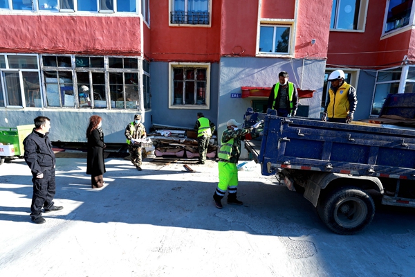 阿木爾林業(yè)局管理服務(wù)中心聯(lián)合環(huán)衛(wèi)隊清理樓前亂堆亂放雜物(王力 攝)