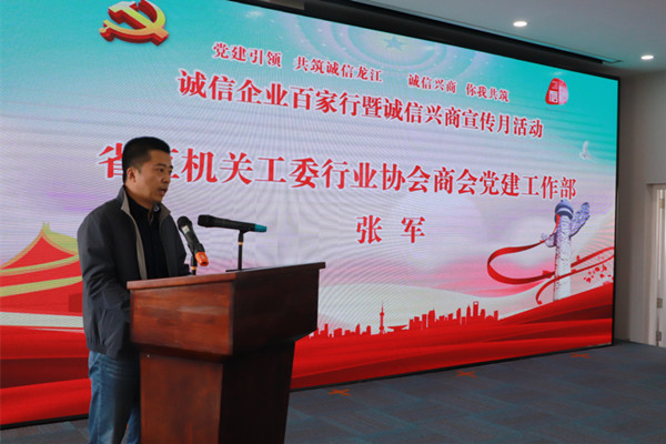 活動(dòng)現(xiàn)場(chǎng),省直機(jī)關(guān)工委行業(yè)協(xié)會(huì)商會(huì)黨建工作部張軍為本次活動(dòng)致辭。他表示,此次活動(dòng)以“黨建引領(lǐng)、共筑誠(chéng)信龍江”為主題,是推動(dòng)黨建工作與行業(yè)協(xié)會(huì)商會(huì)業(yè)務(wù)工作融合發(fā)展的具體舉措,希望省誠(chéng)促會(huì)始終高舉黨的旗幟,堅(jiān)定正確的政治方向,發(fā)揮誠(chéng)信興商聯(lián)盟平臺(tái)作用,廣泛聯(lián)合龍江誠(chéng)信社會(huì)組織,建設(shè)龍江誠(chéng)信高地,打造誠(chéng)信示范群體,形成誠(chéng)信集聚效應(yīng),共興誠(chéng)信之風(fēng)、樹(shù)立誠(chéng)信典范、弘揚(yáng)誠(chéng)信力量,樹(shù)立龍江社會(huì)、龍江企業(yè)誠(chéng)信文化典型,打造我省“誠(chéng)信龍江”閃亮名片。