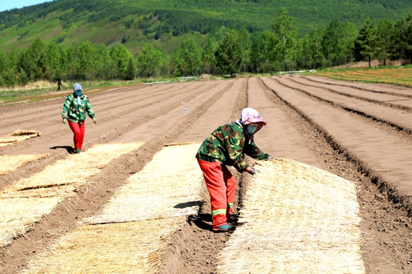 阿木爾林業(yè)局中心苗圃為直播落葉松覆蓋草簾,提升成活率(王力 攝)