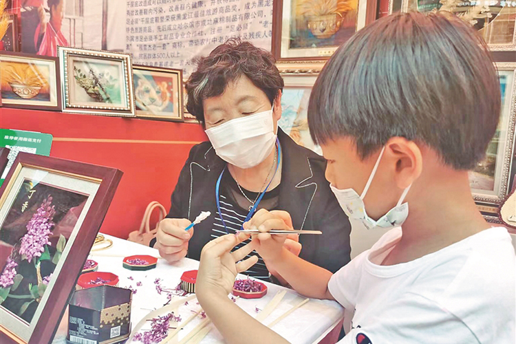 國家級(jí)非遺項(xiàng)目——麥稈剪貼技藝傳承人馬文俠教孩子制作紫丁香。黑龍江日?qǐng)?bào)全媒體記者 荊天旭攝