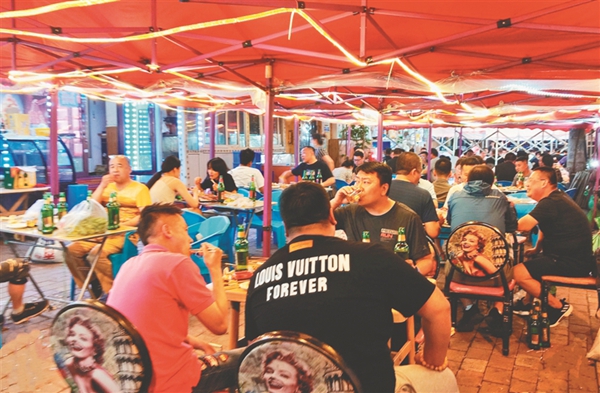 夜幕降臨,冰城街路的大排檔里,人們一邊吃著燒烤海鮮,一邊喝著啤酒,談天說地,不亦樂乎……仲夏六月,在大排檔允許外擺政策的推動下,夏日“夜經(jīng)濟”越來越火熱,冰城濃濃的“煙火氣”回歸。大排檔既豐富了市民生活,冰城的快樂消費也開始了。