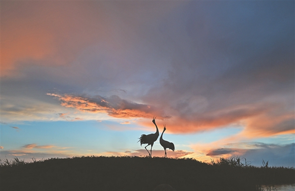 6月,齊齊哈爾市東南26公里處,湖澤密布,葦草叢生,滿目蔥蘢,一群丹頂鶴在天空中展翅翱翔、九霄長鳴。每年6月~8月,是齊齊哈爾扎龍濕地最美麗的時節(jié)。傍晚,迎著晚霞,曲項向天,引吭高歌,一幅美麗的山水畫卷盡收眼底。