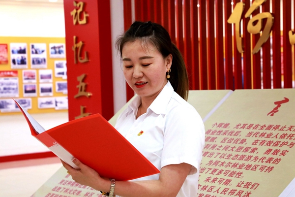 阿木爾林業(yè)局管理服務(wù)中心黨員杜淼在朗誦詩(shī)歌《七月的天空》(王力 攝)