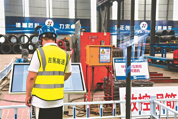 鋼筋加工車間里一處3D立體投影,讓工人們可以直觀看到自己加工后的構(gòu)件將用于整體鋼筋骨架的哪個部位。任書法說,吉黑高速項目打造智慧梁廠,采用了數(shù)控鋼筋滾焊機、數(shù)控鋼筋剪切生產(chǎn)線、數(shù)控鋼筋彎曲中心+自動上料配套等設(shè)備,以前這么大的加工廠要30多人,現(xiàn)在只需一半的人力,就能干出兩倍的工作量,極大提高了施工精度和效率。