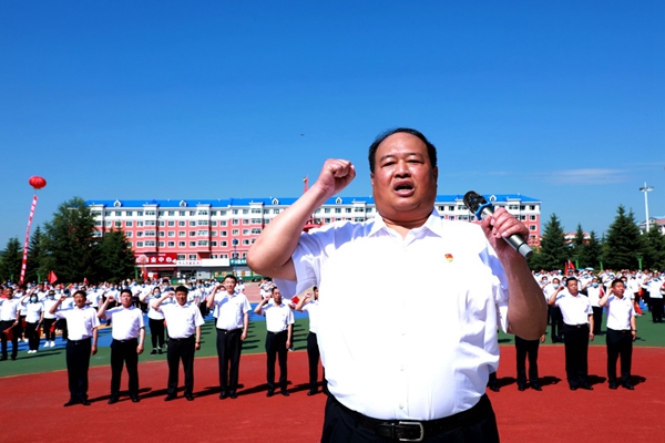 青年黨員母立巖手舉黨旗健步跑向藍莓廣場主席臺,把黨旗交到了林業(yè)局黨委書記胡守慶手中,胡守慶揮舞黨旗,臺下黨員齊聲說道:“不忘初心、牢記使命”。