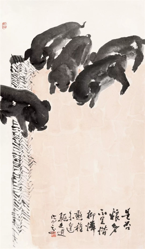 湯文選的人物、山水、花鳥、墨虎等一系列作品,融會著、貫穿著“三種傳統(tǒng)”?;螂[或顯,或化解之,或凝聚之,或熔裁之,或獨(dú)造之?!叭N傳統(tǒng)”,可概括為現(xiàn)實(shí)主義在中國畫發(fā)展歷程中的三段式,亦曰交叉出現(xiàn)的不同歷史內(nèi)涵、文化反映的三種藝術(shù)狀態(tài):首先,是古代現(xiàn)實(shí)主義傳統(tǒng)——“外師造化,中得心源”。其二,是“五四”現(xiàn)實(shí)主義傳統(tǒng)——融合西法,崇尚寫實(shí)。其三,是新中國成立后倡導(dǎo)的革命現(xiàn)實(shí)主義傳統(tǒng)。深入火熱斗爭,深入工農(nóng)兵。學(xué)習(xí)延安木刻,學(xué)習(xí)民間年畫,學(xué)習(xí)蘇聯(lián)油畫現(xiàn)實(shí)主義的創(chuàng)作方法(50年代)。其后,“一手伸向生活,一手伸向傳統(tǒng)”(60年代)。在以上“三種傳統(tǒng)”的交匯點(diǎn)上,伸延出湯文選早期和中期的現(xiàn)實(shí)主義創(chuàng)作之路。湯文選中國畫藝術(shù)的現(xiàn)實(shí)主義,其主要特征為積極的入世態(tài)度,強(qiáng)烈的人文主義色彩,個(gè)性、民族性與時(shí)代性的完美統(tǒng)一,以及嚴(yán)肅的歷史使命感。