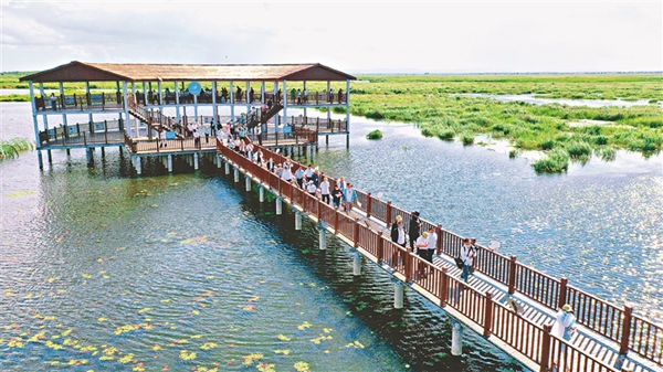 近日,寶清縣七星河國(guó)家級(jí)自然保護(hù)區(qū)濕地內(nèi)迎來大批游客,一望無際的濕地和葦塘讓游客心曠神怡。游客登上觀鳥臺(tái),俯瞰濕地,夕陽下大批的水鳥在七星河內(nèi)覓食嬉戲,“葦蕩連天碧,水鳥漫云空”,一幅人與自然和諧共生的真實(shí)寫照。