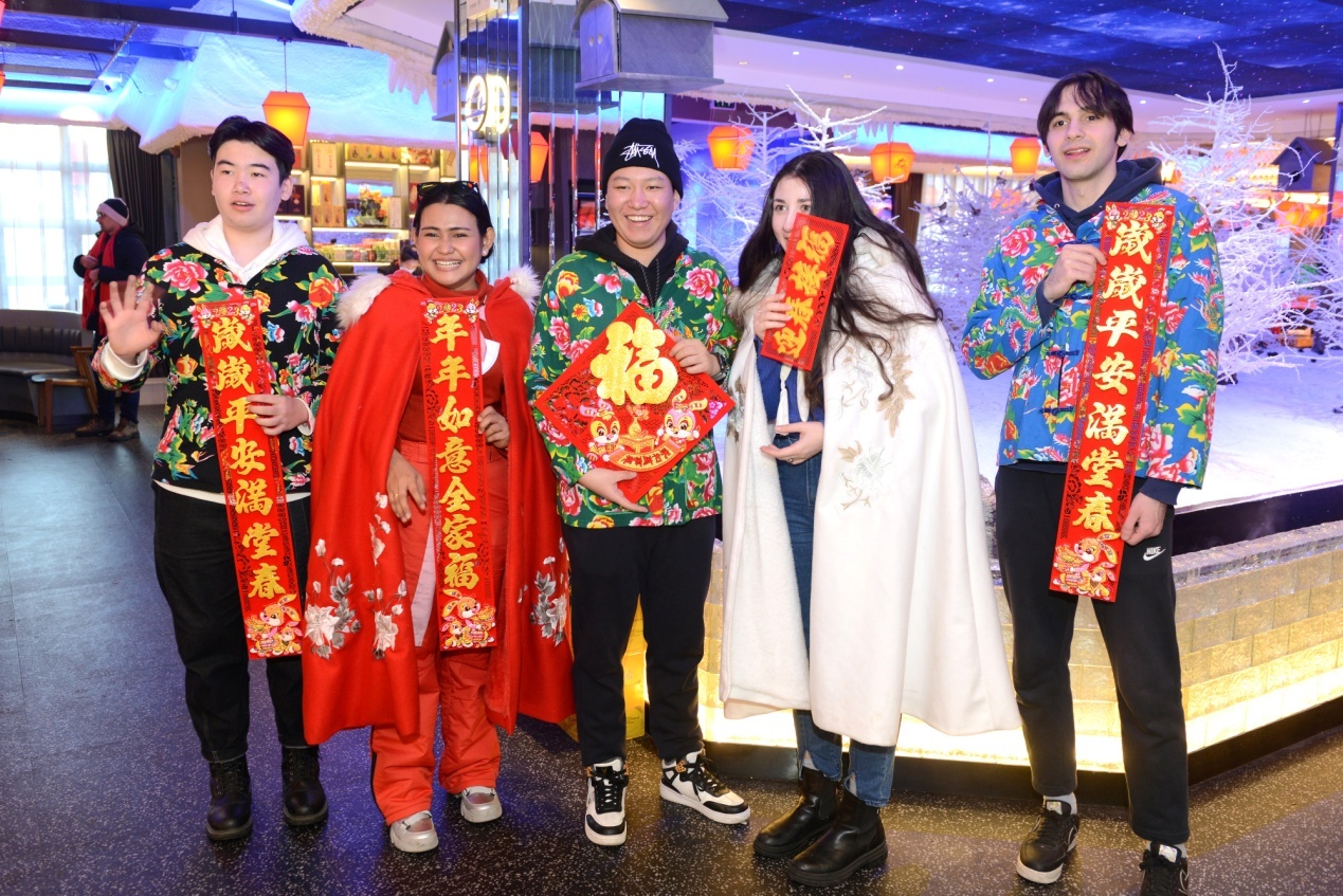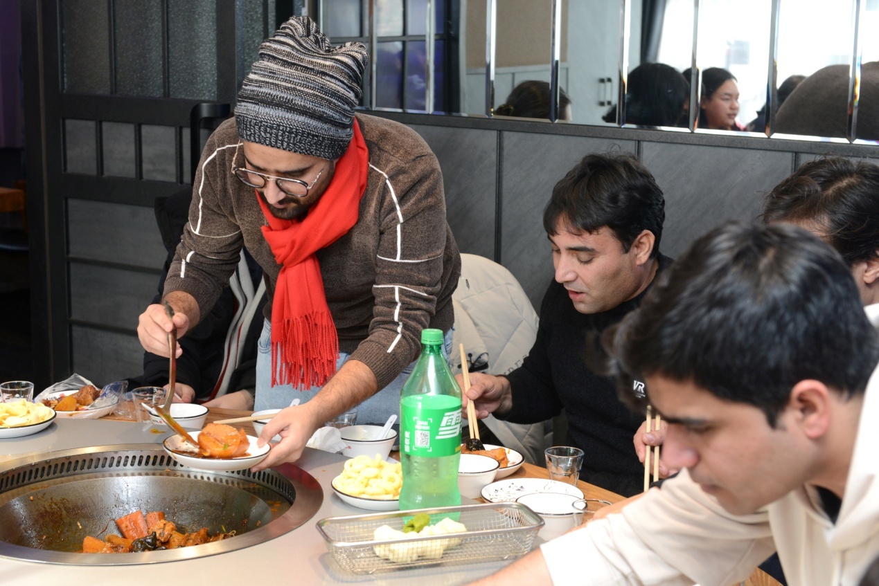 中午,留學(xué)生們品嘗了東北特色美食“鐵鍋燉”——鐵鍋燉大鵝、燉排骨,東北特色鍋包肉、拔絲地瓜讓留學(xué)生們感受了中華美食的魅力,大家紛紛贊嘆中華美食文化的博大精深,雖然遠(yuǎn)離家鄉(xiāng),卻在熱氣騰騰的美食中感受到家的溫暖。品味美食的過程中,有的留學(xué)生穿上東北特色大花襖,有的穿上中國傳統(tǒng)服飾雪披風(fēng),系上花圍巾,大家喜不勝收,將中國元素展示給世界。