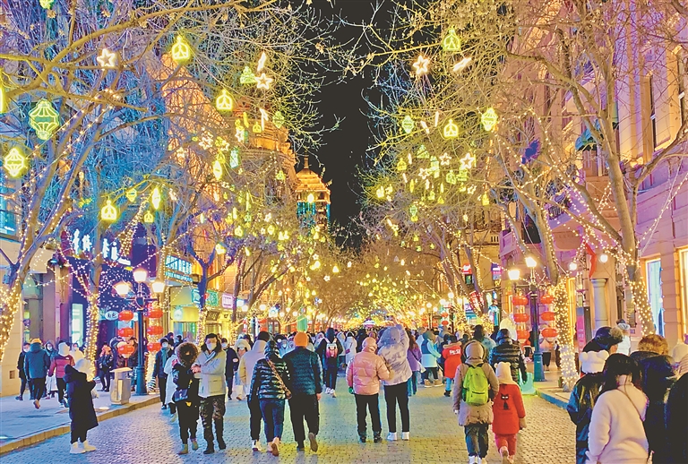 穿過歐式建筑,滿滿冰城風(fēng)情的彩燈以及年味十足的大紅燈籠將哈爾濱中央大街點(diǎn)亮。2023年新年伊始,百年老街呈現(xiàn)出游人如織的火熱場面,熟悉又熱鬧的氣氛彌漫在老街的各個角落,煙火氣持續(xù)升騰。欣賞唯美的陽臺音樂秀,品嘗鍋包肉、馬迭爾冰棍等特色美食,打卡“星空燈”、“雪妮妮網(wǎng)紅兔子”雪雕……游客和市民沉浸在一個個融合創(chuàng)意與冰城特色的冰雪玩法和體驗(yàn)之中,盡情享受冰雪帶來的歡樂。數(shù)據(jù)顯示,僅春節(jié)期間,中央大街日均客流量維持在40萬人次,高峰時(shí)期達(dá)到70余萬人次。