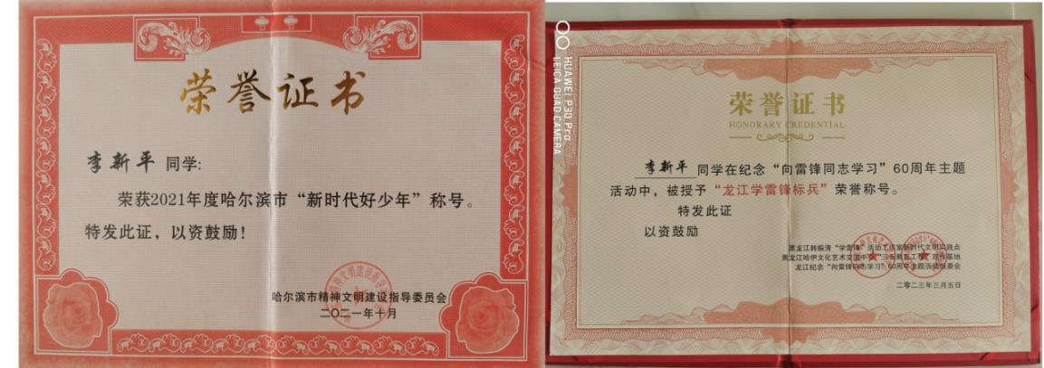 李新平同學(xué)就讀于呼蘭區(qū)建國小學(xué)五年五班,他勤奮好學(xué)、品學(xué)兼優(yōu)、樂觀向上、自強(qiáng)自立。從一年級開始就擔(dān)任班長職務(wù),先后多次被評為三好學(xué)生、優(yōu)秀學(xué)生干部、優(yōu)秀少先隊(duì)員,榮獲2021年度哈爾濱市“新時(shí)代好少年”稱號、榮獲2021年第三屆龍江好少年活動(dòng)“龍江愛心大使”和“城市形象大使”,2022年被黑龍江省積善之家?guī)头鲋行那嗌倌曛驹刚呖傟?duì)授予“公益達(dá)人”稱號,2023年在紀(jì)念“向雷鋒同志學(xué)習(xí)”60周年主題活動(dòng)中被韓振清學(xué)雷鋒創(chuàng)新工作室授予“龍江學(xué)雷鋒標(biāo)兵”榮譽(yù)稱號。在多類體育運(yùn)動(dòng)競賽活動(dòng)中獲得等級證書及榮譽(yù)稱號,出色的表現(xiàn)和真誠的付出,贏得了大家的信任、同學(xué)們的信賴、家長們的喜愛。