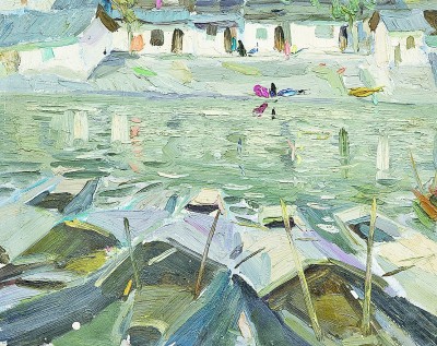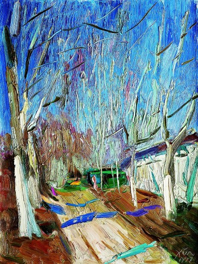 在諶北新的代表性作品里,無論何種結(jié)構(gòu),色調(diào)、筆觸、造型、線條都可以獨(dú)立觀賞。一塊厚堆的白色顏料,可以是云朵、是白墻,或是前后重疊的船帆。用筆的疏密、狀貌和節(jié)奏都有獨(dú)立存在的意義,既可以像欣賞書法用筆一樣拋開物象去體味,又可以去想象和填補(bǔ)與之恰合的物象和自然關(guān)系。諶北新對書法的深入研究和長期的繪畫寫生,以及他對物象、空間、色彩關(guān)系的觀察與創(chuàng)造實踐,使其作品能夠?qū)⒉煌谋憩F(xiàn)手法有機(jī)地融為一體。比如一筆畫下去,既表現(xiàn)空間層次,也體現(xiàn)厚薄輕重,同時展現(xiàn)光線的微妙變化。這種綜合性的呈現(xiàn)效果,實際上也契合著中國山水畫所追求的通過用筆的輕重緩急,通過虛實濃淡的墨色渲染,通過遠(yuǎn)近高低的畫面布局,表現(xiàn)山水對人的情感與心靈的影響。而諶北新的風(fēng)景油畫,正是基于中國人對山川草木的喜愛之情,通過體察和探求提煉出的獨(dú)特意象,它符合現(xiàn)代人的心理需求,也呼應(yīng)著畫家畢生追求的藝術(shù)境界——須其自來,不以力構(gòu)。