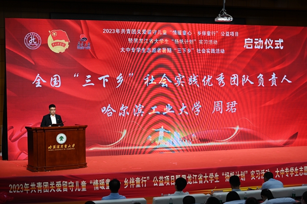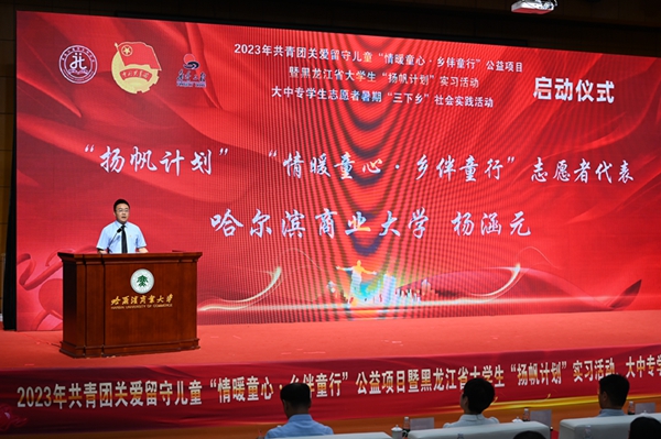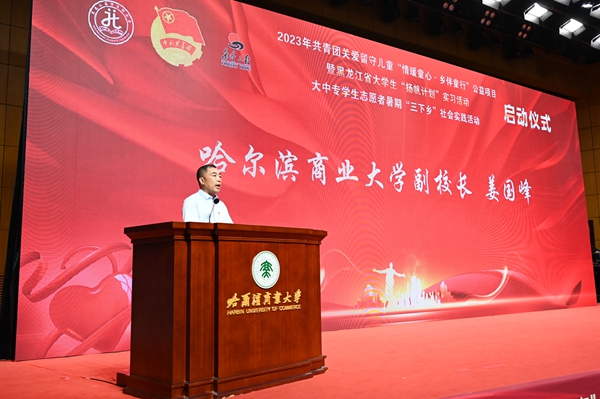 本次活動(dòng),在哈爾濱商業(yè)大學(xué)的大力支持下順利開展,哈爾濱商業(yè)大學(xué)副校長姜國鋒在儀式上致辭,他說:“學(xué)校建校71年來,立足立德樹人根本任務(wù),聚焦‘為黨育人,為國育才’的職責(zé)使命,在不斷加強(qiáng)‘第一課堂’建設(shè)的同時(shí),還依托學(xué)?!惑w兩翼’文化育人模式,充分發(fā)揮實(shí)踐育人的作用,通過開展‘三下鄉(xiāng)’‘返家鄉(xiāng)’等社會(huì)實(shí)踐和‘西部計(jì)劃’‘興邊富民’志愿服務(wù)項(xiàng)目,引導(dǎo)廣大青年學(xué)生堅(jiān)持用習(xí)近平新時(shí)代中國特色社會(huì)主義思想凝心鑄魂,在社會(huì)的課堂中‘受教育、長才干、作貢獻(xiàn)’。”活動(dòng)現(xiàn)場,播放《黑龍江省希望工程30年與光同行》和黑龍江省大中專學(xué)生志愿者暑期“三下鄉(xiāng)”社會(huì)實(shí)踐活動(dòng)宣傳片,與會(huì)領(lǐng)導(dǎo)上臺(tái)共同啟動(dòng)了“情暖童心·鄉(xiāng)伴童行”公益項(xiàng)目、大學(xué)生“揚(yáng)帆計(jì)劃”實(shí)習(xí)活動(dòng)、大中專學(xué)生志愿者暑期“三下鄉(xiāng)”社會(huì)實(shí)踐活動(dòng)。