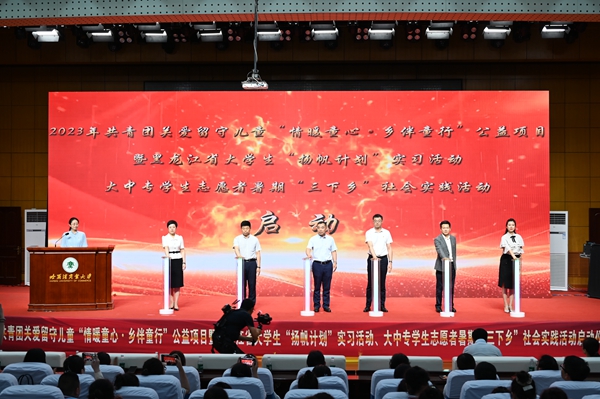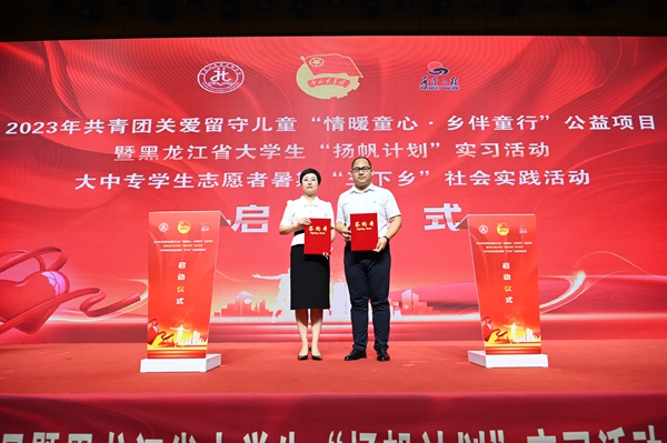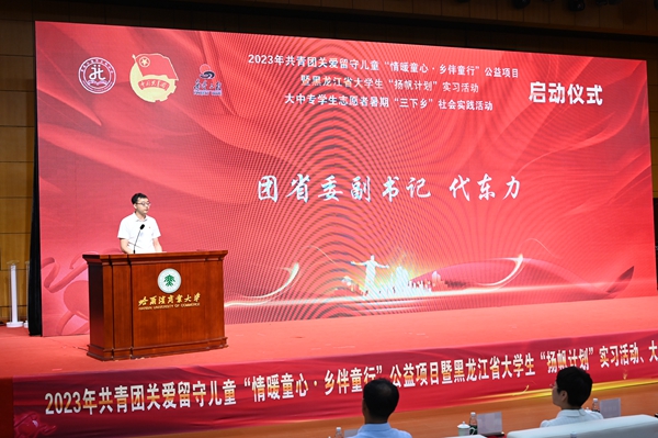 黑龍江經(jīng)濟(jì)網(wǎng)訊(王丹陽 記者祝東)7月5日,2023年共青團(tuán)關(guān)愛留守兒童“情暖童心·鄉(xiāng)伴童行”公益項(xiàng)目暨黑龍江省大學(xué)生“揚(yáng)帆計(jì)劃”實(shí)習(xí)活動(dòng)、大中專學(xué)生志愿者暑期“三下鄉(xiāng)”社會(huì)實(shí)踐活動(dòng)啟動(dòng)儀式在哈爾濱商業(yè)大學(xué)隆重舉行。共青團(tuán)黑龍江省委副書記代東力、陳海平,哈爾濱商業(yè)大學(xué)副校長姜國峰,省直機(jī)關(guān)團(tuán)工委書記趙明瑞,黑龍江省人力資源和社會(huì)保障廳、省知識(shí)產(chǎn)權(quán)局、省人民檢察院、省青少年發(fā)展基金會(huì)、哈爾濱市南崗區(qū)民政局、哈爾濱海關(guān)、哈爾濱海事局相關(guān)領(lǐng)導(dǎo),以及哈爾濱商業(yè)大學(xué)的志愿者和哈爾濱市樂業(yè)小學(xué)師生代表參加本次活動(dòng)。