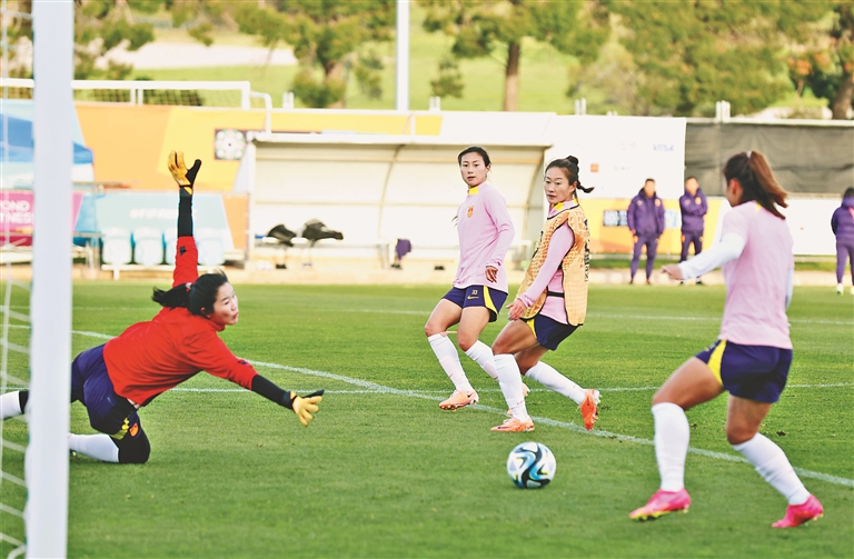 7月10日歸隊(duì)的王霜已完全融入,過障加速、接球射門,王霜彈無虛發(fā)。在6對(duì)6半場演練中,助理教練馬曉旭加入到王霜率領(lǐng)的黃隊(duì),與唐佳麗、張馨所在的紅隊(duì)展開對(duì)攻大戰(zhàn)??焖俚墓シ擂D(zhuǎn)換、漂亮的進(jìn)球讓看臺(tái)上的球迷興奮不已,有球迷甚至打開了手機(jī)直播。