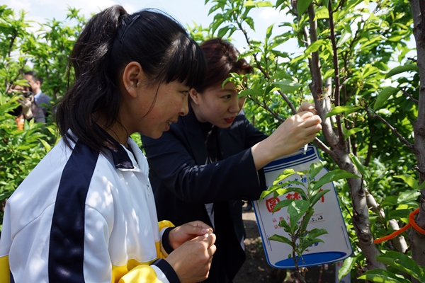 儀式后,與會(huì)領(lǐng)導(dǎo)和孩子們一同參觀青春果園,在“希望”“圓夢(mèng)”“愛(ài)心”等六棵樹下共同掛上“哈藥小藍(lán)瓶”手工制品。