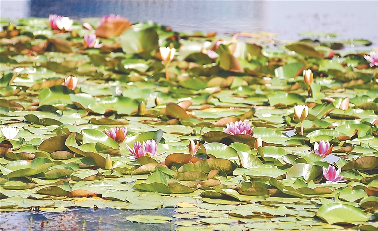 時下,位于哈爾濱市道里區(qū)的群力丁香公園人工湖內,大片的睡蓮競相綻放,吸引眾多市民和游客前來觀賞拍照。這些睡蓮花朵有白色的、粉色的、紅色的,驚艷綻放,美在當“夏”。