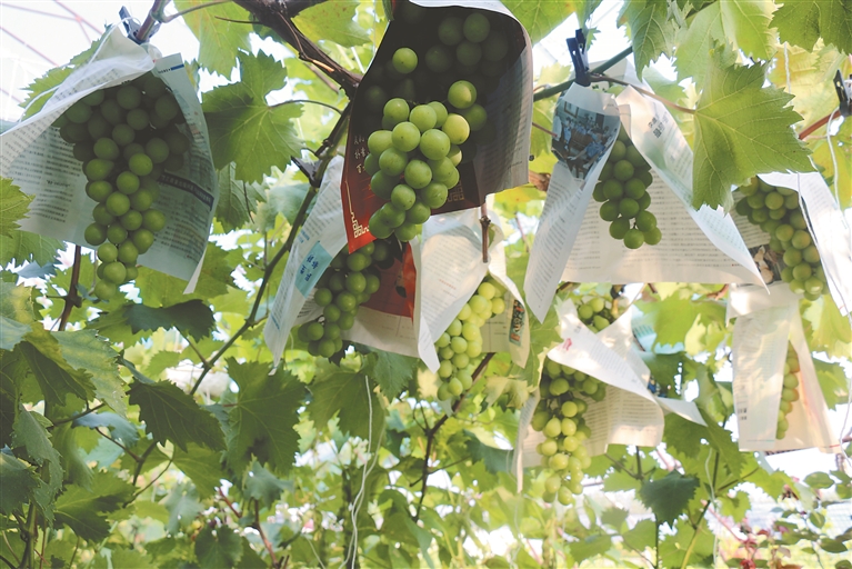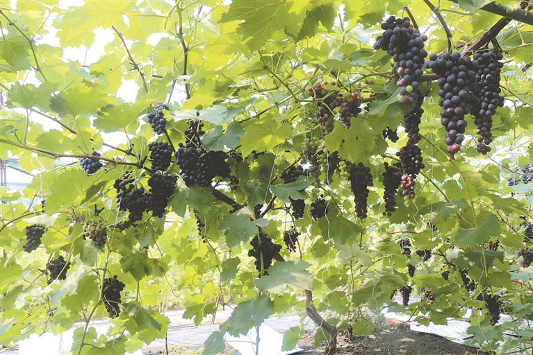 “‘陽光玫瑰’是近幾年引進的新品種,因其果肉多、甜度高、口感佳,受到不少市民的喜歡,每年都有不少商家、居民前來采購。目前,‘夏黑’已處于成熟期,‘陽光玫瑰’預計9月中下旬成熟?!辈軅俳榻B。