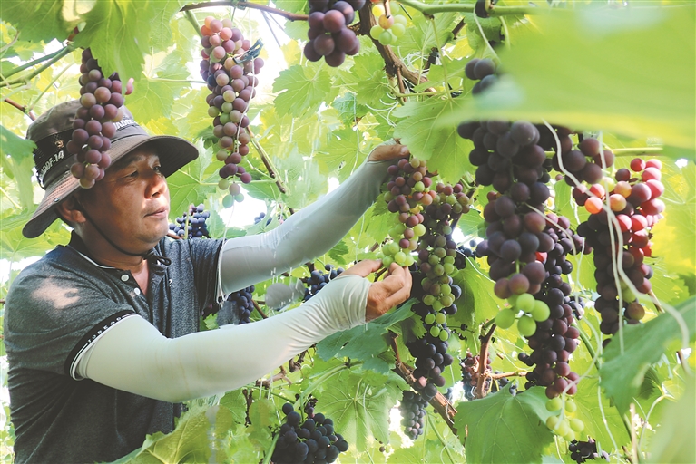 “春棚栽培的葡萄在8月中旬成熟,而在暖棚里,由于溫度、濕度得到科學精準控制,葡萄成熟得更早,產(chǎn)量更高。7月10日左右即可上市,搶占市場空缺?!笔卟斯矩撠熑送踯姀娺呎f一邊拿起手機拍攝,為一周后葡萄上市進行宣傳。