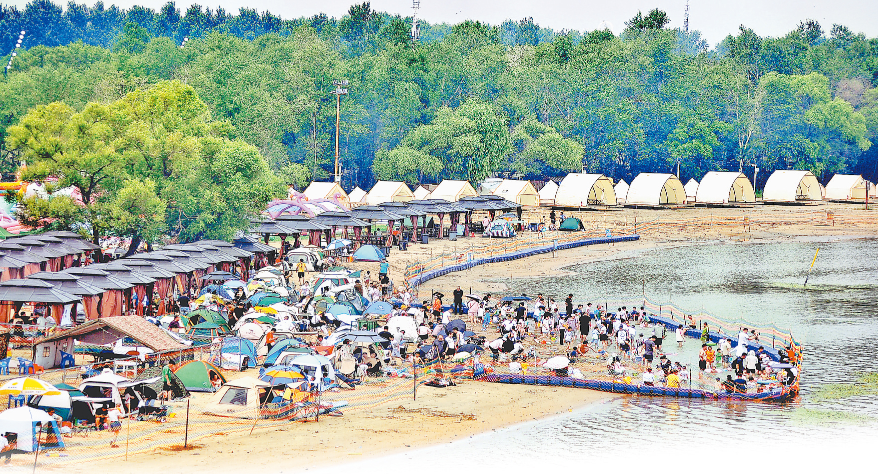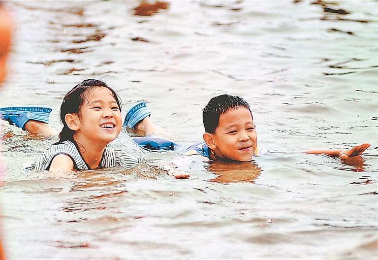 日前,哈爾濱市江北公路大橋附近的公益沙灘浴場內(nèi),許多市民帶著孩子在戲水納涼。這處沙灘浴場面積有數(shù)百平方米,水中最深處只有半米多,周圍設(shè)置了隔離帶、安全網(wǎng)。孩子們盡情玩樂,有的在學(xué)游泳、有的玩水槍、有的在堆沙子、有的在挖“水渠”,叫喊聲、歡笑聲不絕于耳。
