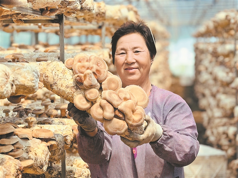 陽光透過棚室,溫?zé)岬目諝庵袕浡ü教赜械南銡?。一根根整齊擺放的菌棒上,淡褐色的花菇簇?fù)矶?,“傘面”花紋爆開,煥發(fā)著勃勃生機。“一棟高標(biāo)準(zhǔn)大棚放置一萬根菌棒,每年生長季可以采收六至七茬,一棟大棚至少收獲2萬斤花菇,按市場價7元一斤算,產(chǎn)值就是14萬元?!必?fù)責(zé)花菇生產(chǎn)技術(shù)管理的趙景龍說起花菇種植的“錢景”,一臉笑意。